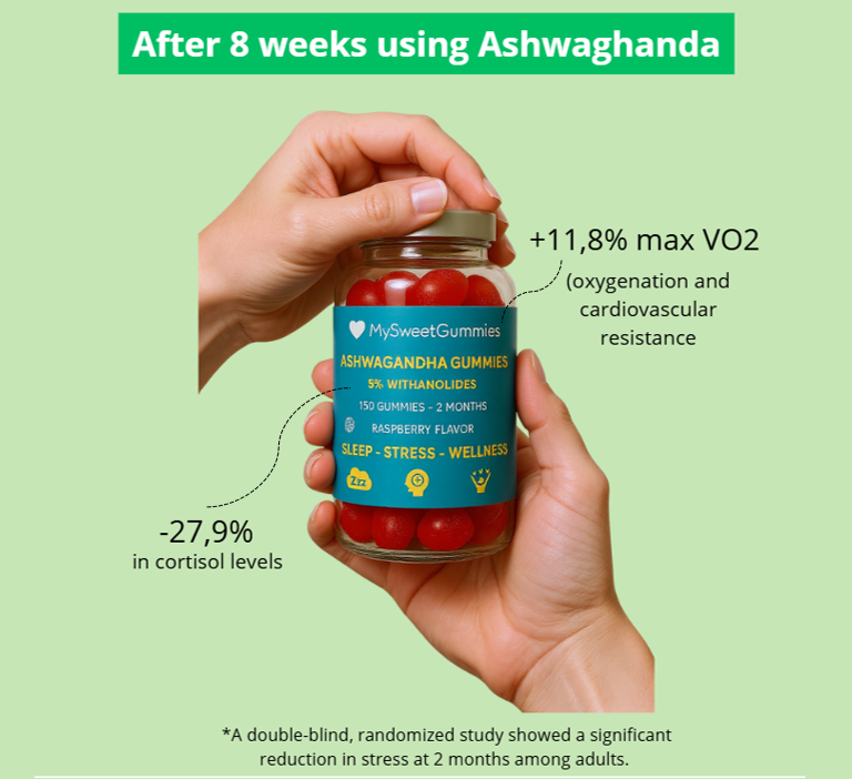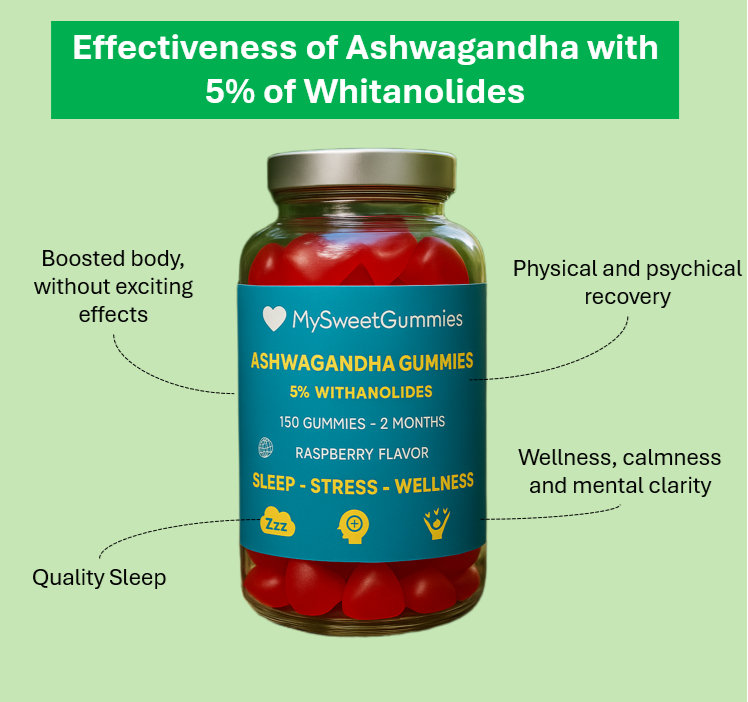 Experience the true effectiveness of Ashwagandha with 5% withanolides. My Sweet Gummies naturally support quality sleep, stress relief, and mental clarity—while boosting your body without overstimulation. Designed for both physical and psychological recovery, they help you feel calmer, clearer, and more balanced every day.