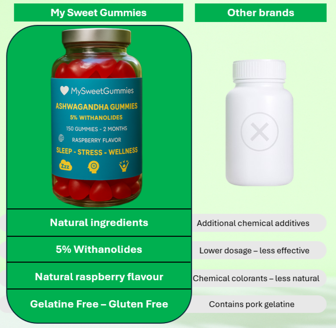 Choose gummies that put your wellness first. My Sweet Gummies deliver 5% withanolides for real results, crafted with natural ingredients and delicious raspberry flavor. Unlike other brands with chemical additives, low dosages, and animal-based gelatine, our gummies are clean, gluten-free, and gelatine-free—so you can enjoy powerful stress relief and better sleep, naturally.